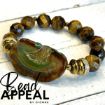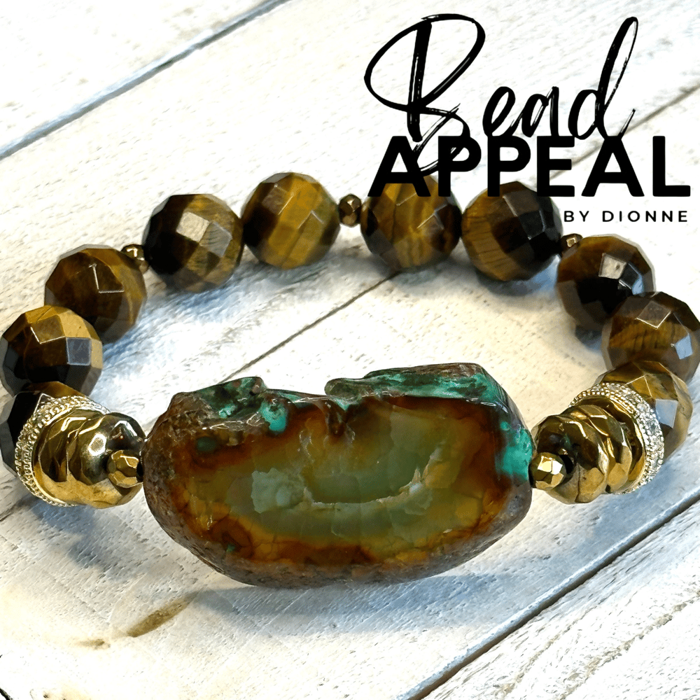 12mm Tiger’s Eye Bead Bracelet with Agate Slice Centerpiece. Accented with CZ Spacers and Hematite
