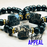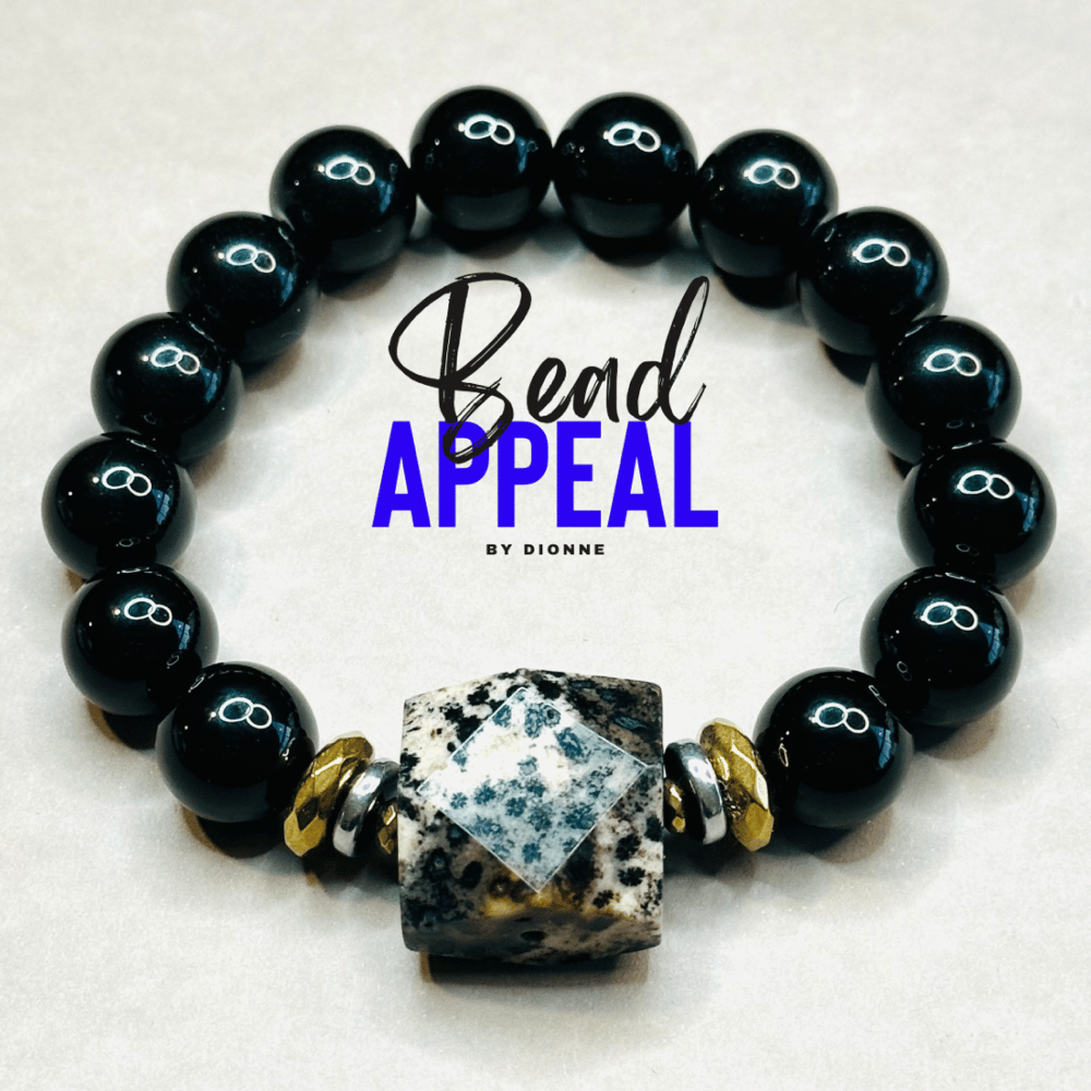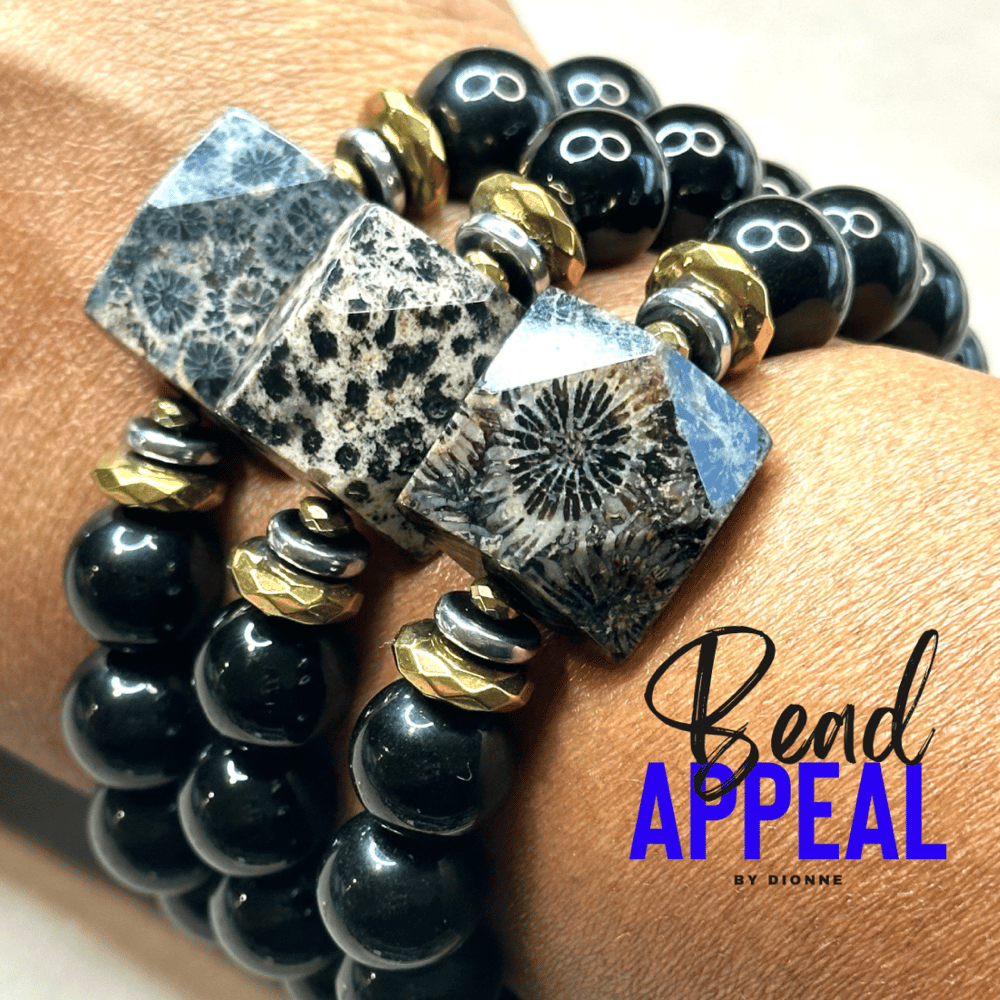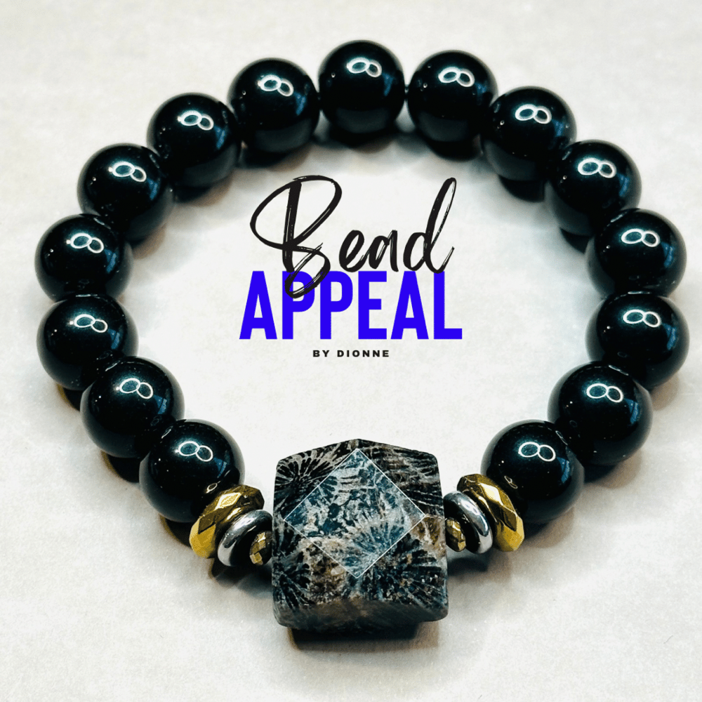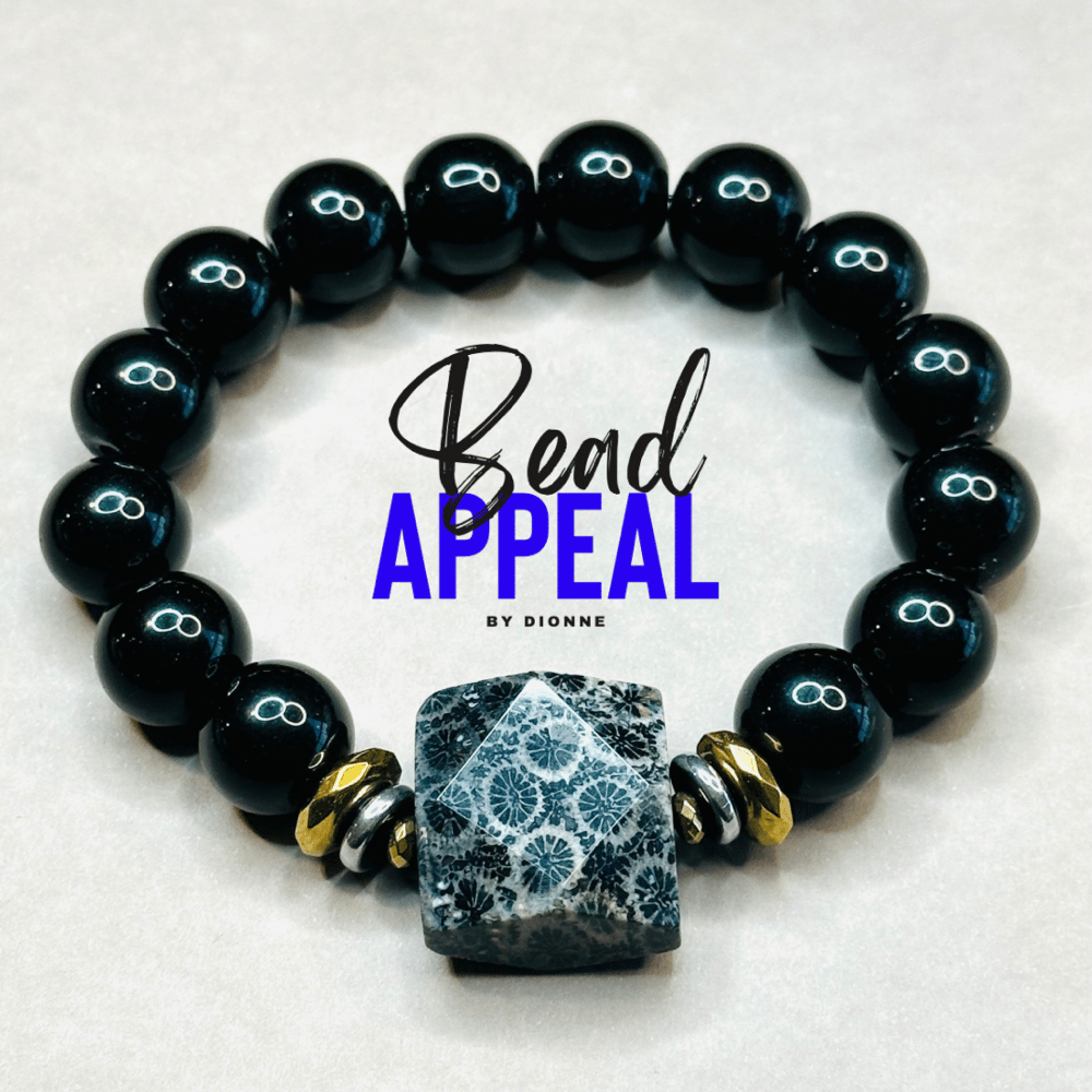 12mm Black Onyx Bead Bracelets with Coral Fossil Centerpiece Accented with Multicolor Hematite