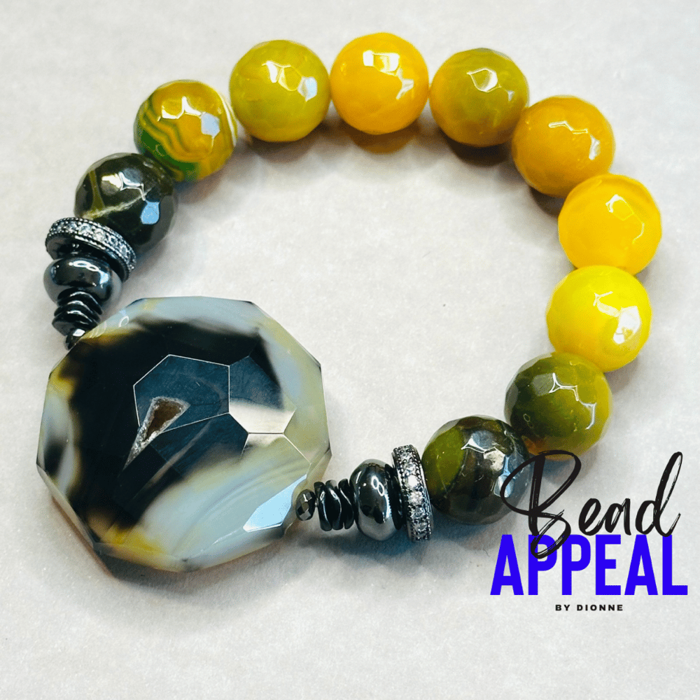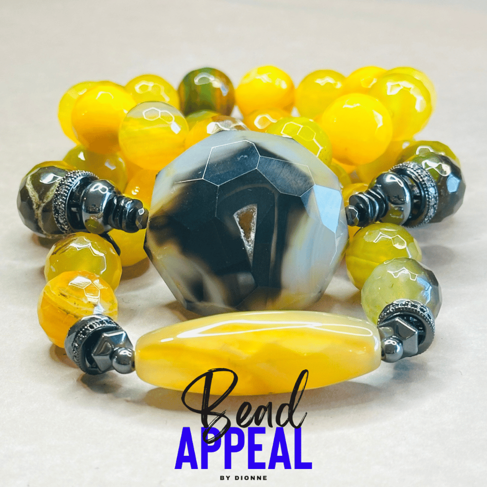 14mm Agate Bead Bracelet Set. Large Agate Centerpiece with Druzy Effect. Large Oval Centerpiece. CZ and Hematite Accents.