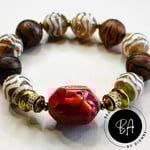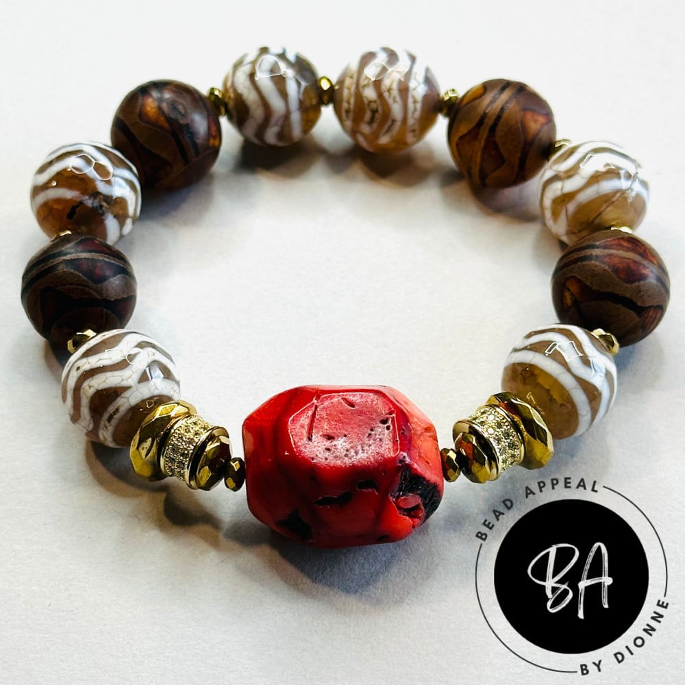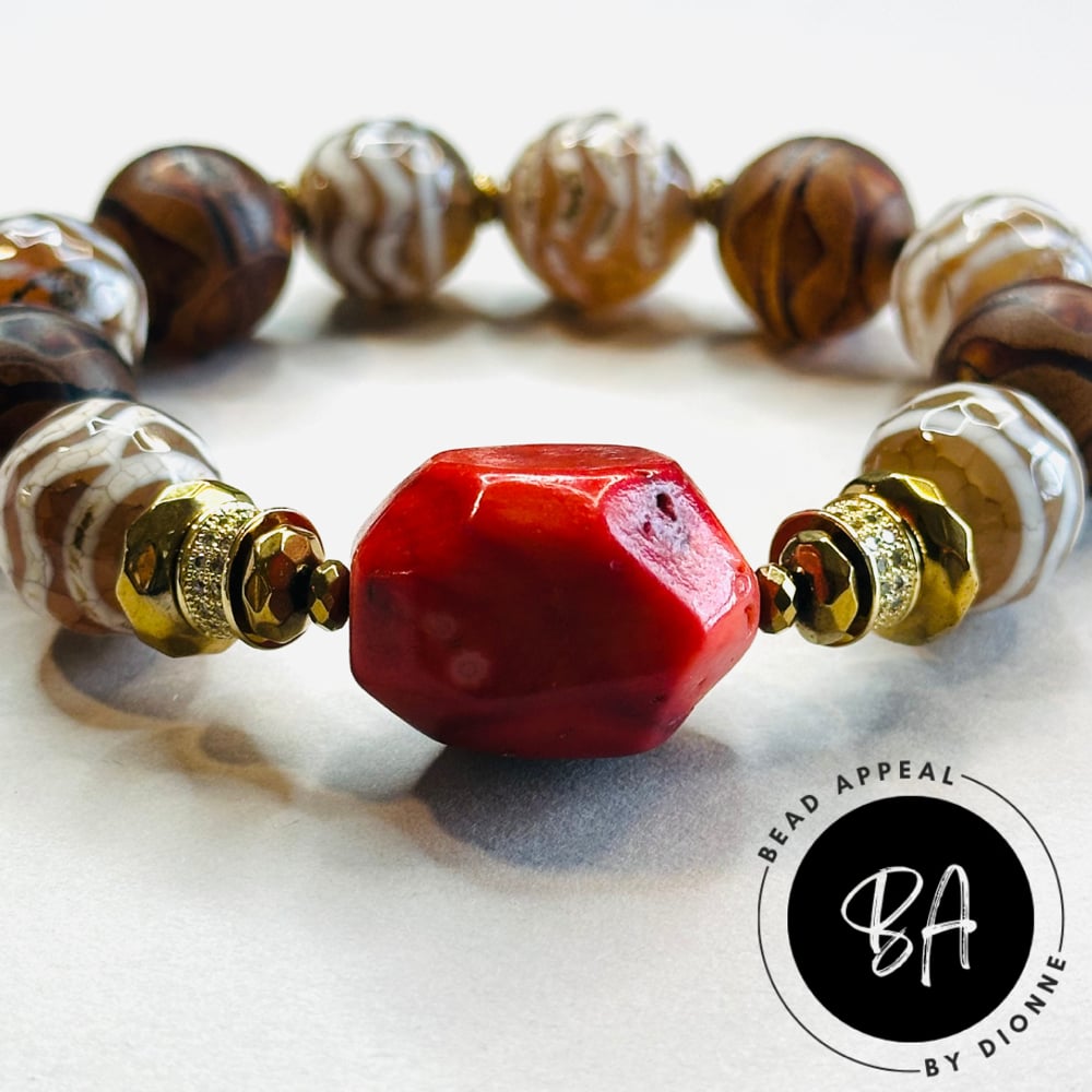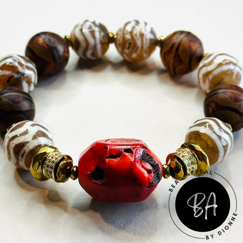 14mm Tibetan Bead Bracelet with Coral Centerpiece. Accented with CZ and Hematite.