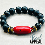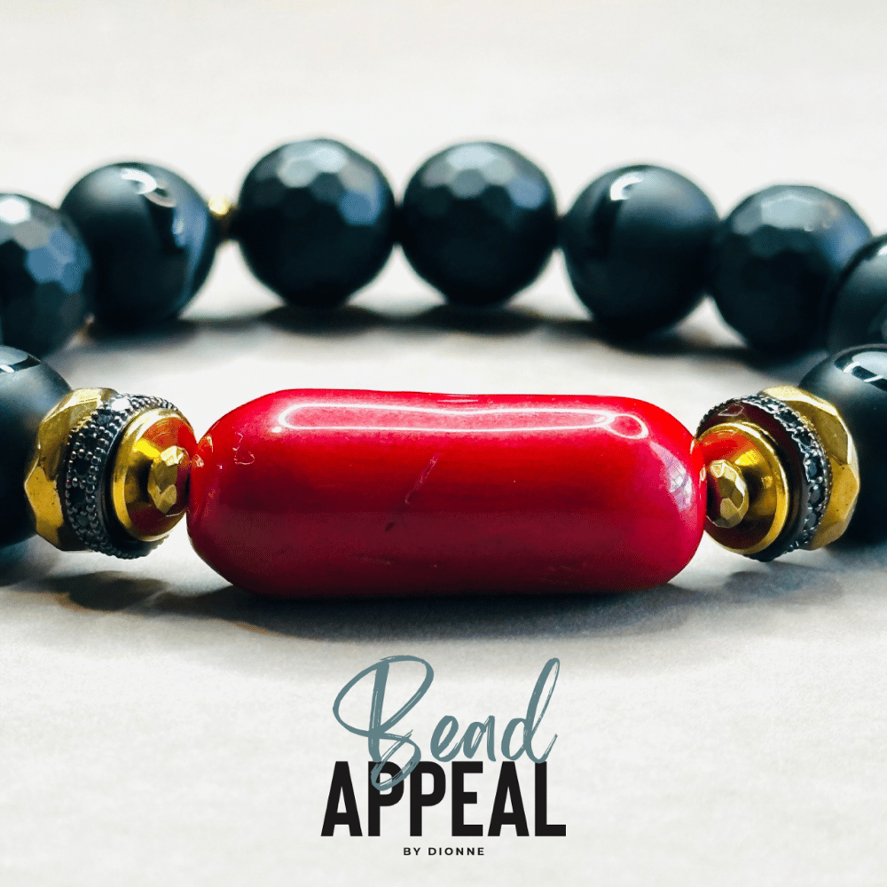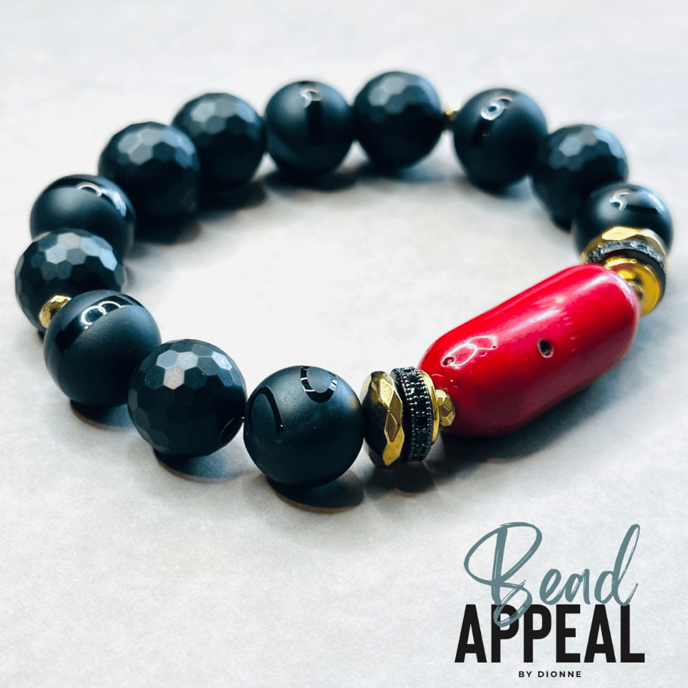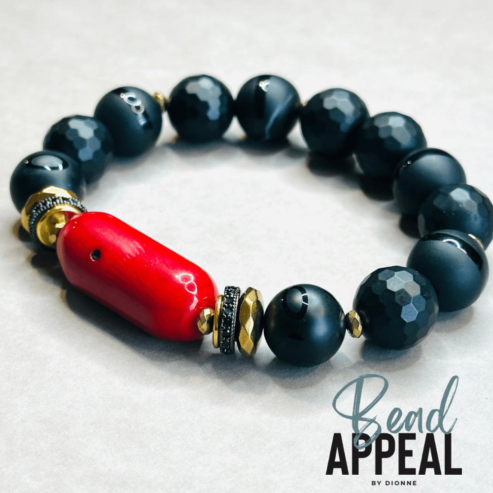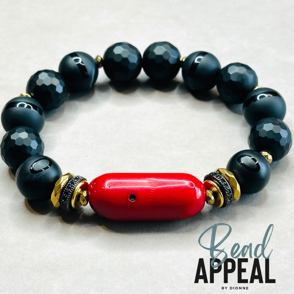 Black Onyx, Tibetan and Coral Mix Bead Bracelet. CZ and Hematite Spacers.