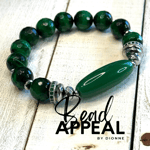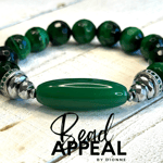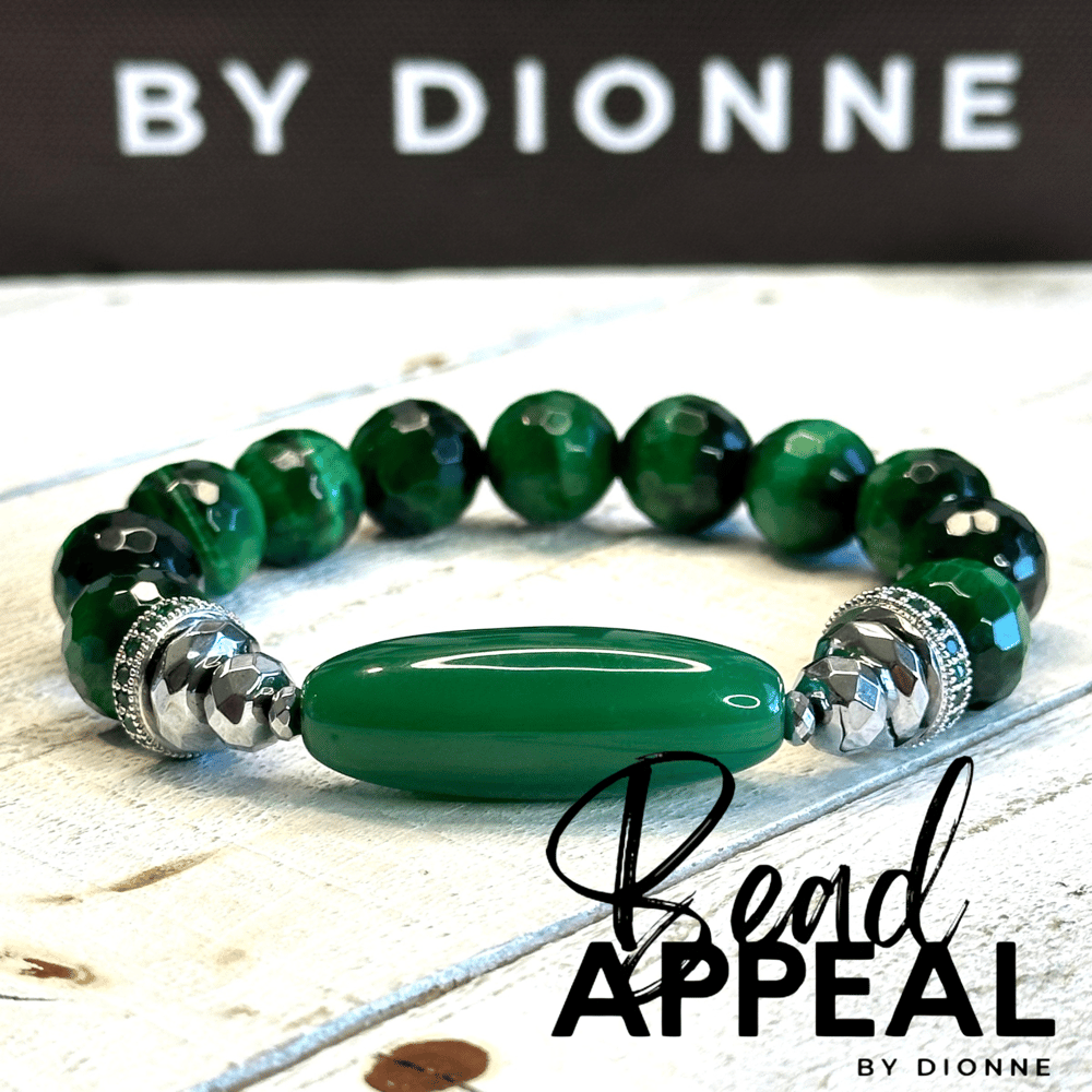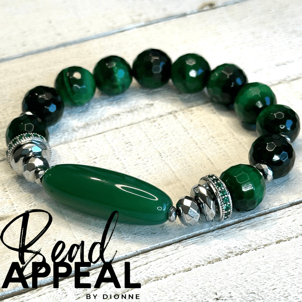 12mm Emerald Green Tiger’s Eye Bead Bracelet with Agate Focal Bead. Accented with CZ and Hematite.