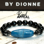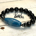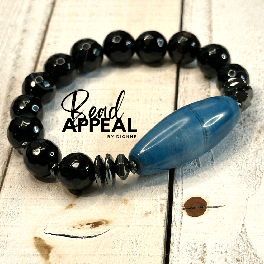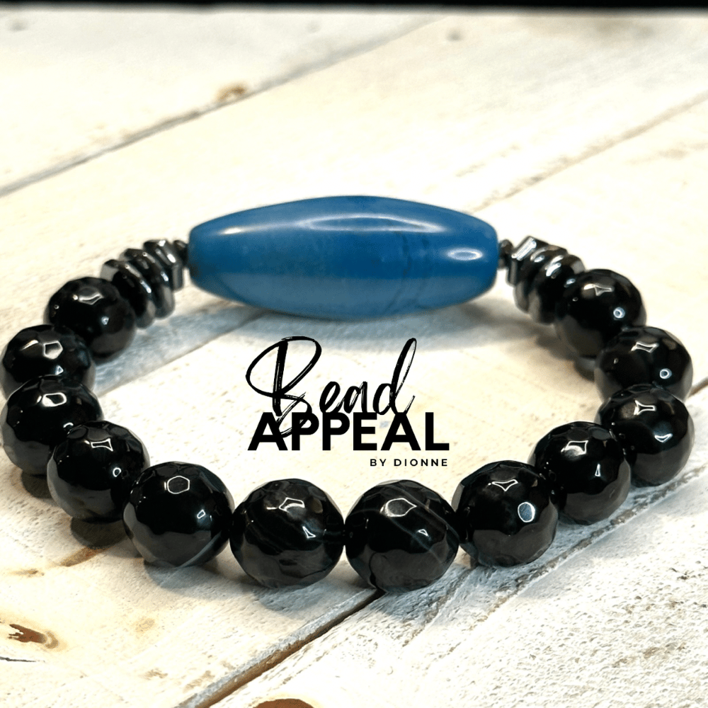 12mm Agate Bead Bracelet with Matte Blue Agate Centerpiece. Hematite Accents
