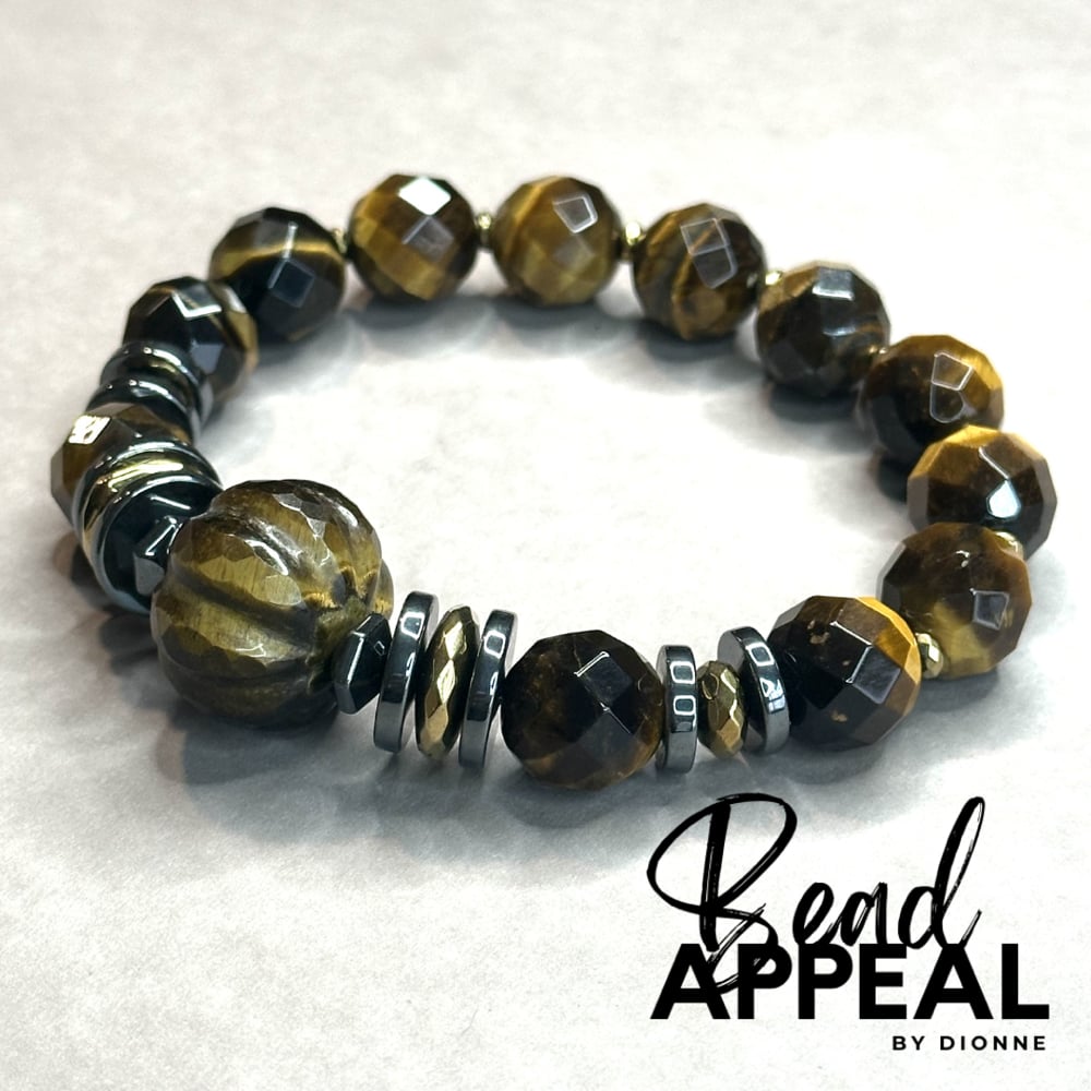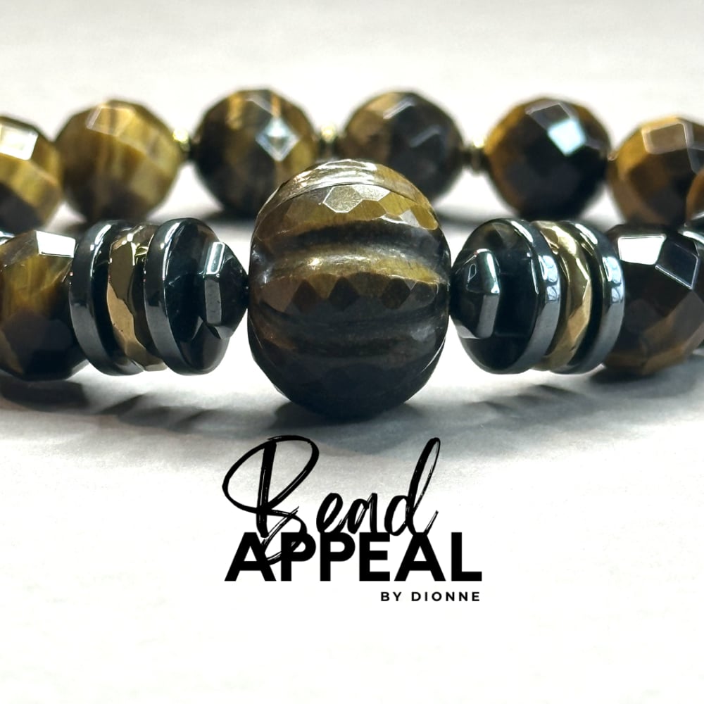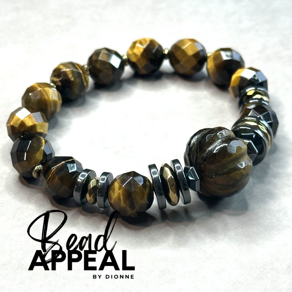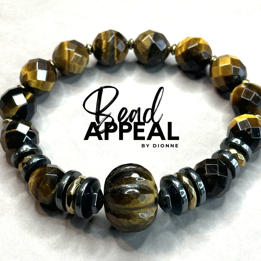 12mm Tigers Eye Bead Bracelet with Large Tigers Eye Centerpiece, Accented with Hematite