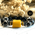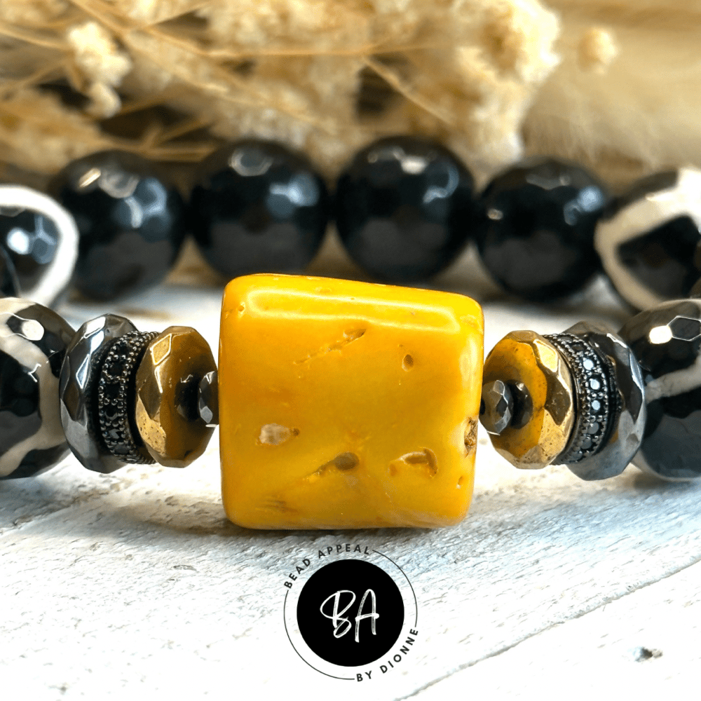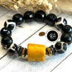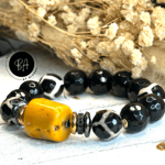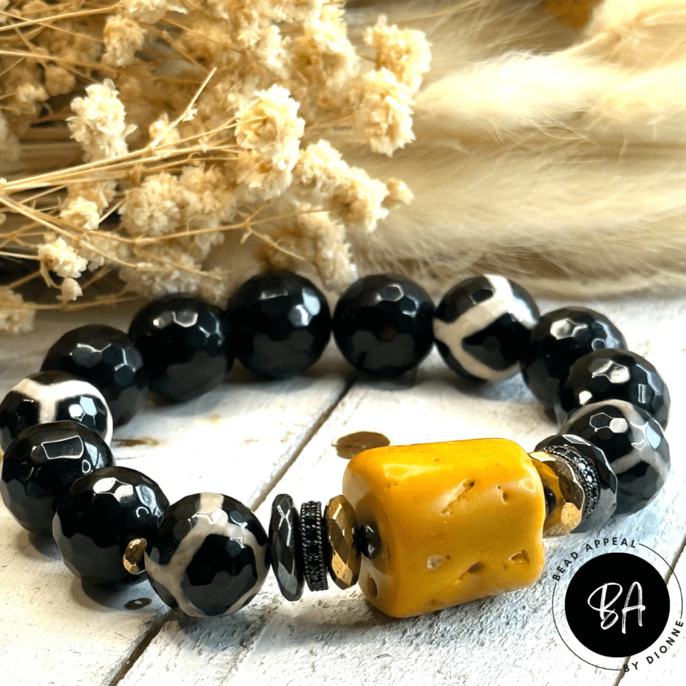 14mm Agate and Tibetan Bead Bracelet with Coral Centerpiece. Accented with CZ and Hematite